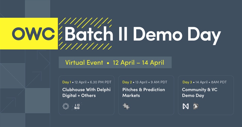 Join Open Web Collective for Batch II Demo Day on Wednesday, April 14th from 8 am -10 am PST. Ten startups pioneering the Open Web will chat with VCs, community members, and Thought Leaders and showcase their projects.We'll have markets on Flux (launched on NEAR mainnet Q1'21), remarks from 1.inch Exchange (OWC alumni), and updates from Illia on NEAR and path to Open Web, and more!