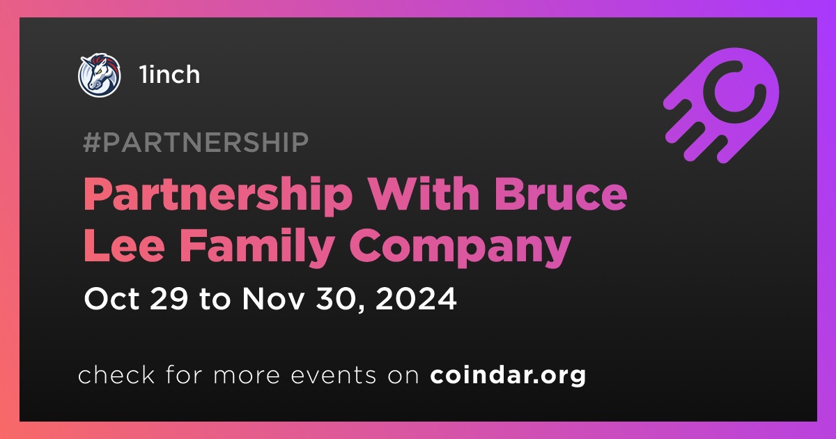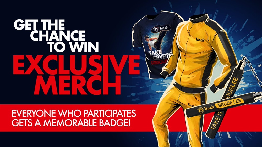 1inch has announced a partnership with Bruce Lee Family Company. They are conducting a merchandise raffle where participants can win exclusive Bruce Lee-themed items such as a yellow tracksuit, T-shirt, and nunchucks. The raffle is scheduled from October 28 to November 30 and includes a guaranteed POAP NFT.