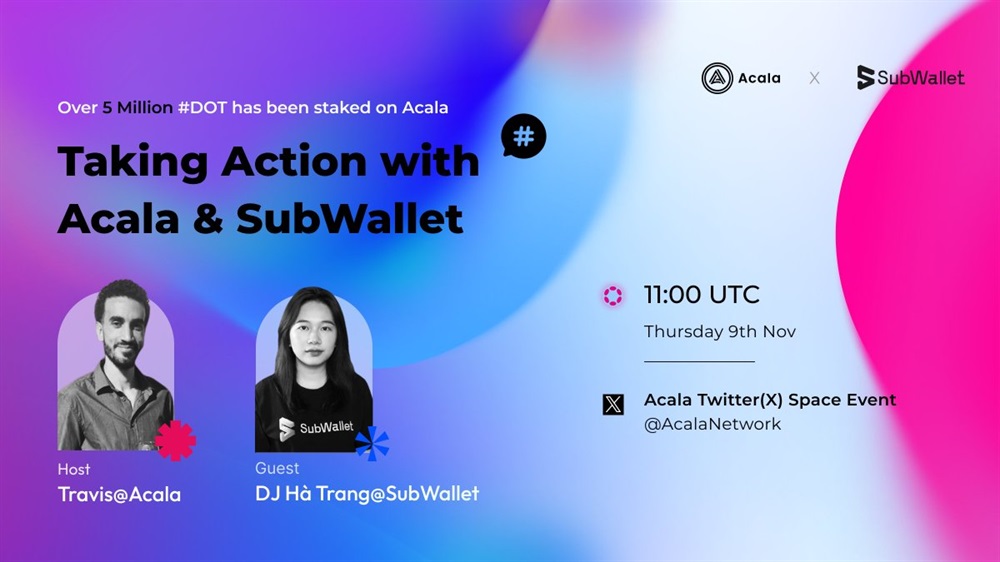 Acala will host an AMA on X on November 9th at 11:00 UTC The focus of the event will be on the cooperative initiatives between Acala and SubWallet. The alliance between the two entities and the potential opportunities it creates will be discussed.