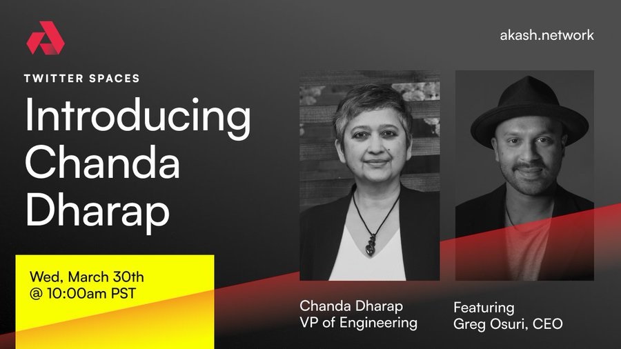 We're excited about @chandadharap joining Akash and we want Akashian's to get to know her. Join us at our next Twitter Space and get to know Chanda and her vision for Akash.