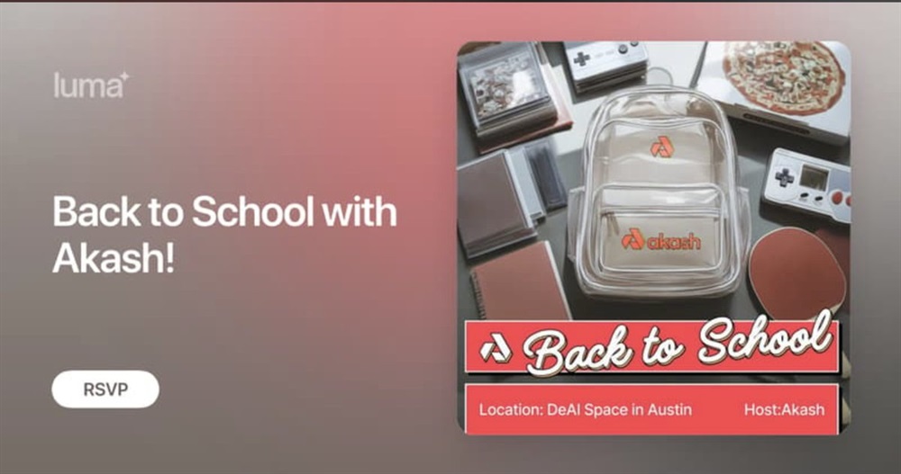 Akash Network will hold a back-to-school event on September 5th in Austin. Planned activities include food and beverages, games with prizes and the distribution of branded backpacks to the first 50 attendees.