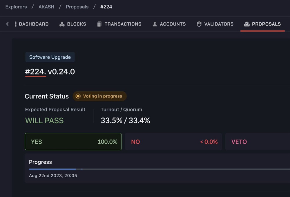 Akash Network has announced that proposal 224 has reached a quorum. This signifies that the upgrade to Akash mainnet v.6.0 is set to pass successfully on August 31st.