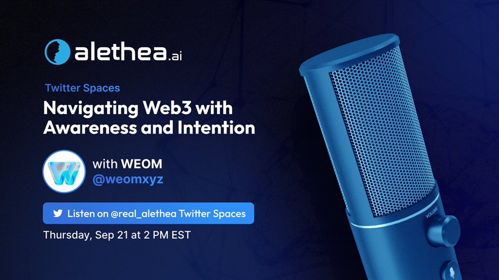 Alethea Artificial Liquid Intelligence Token will host an AMA on X on September 21st featuring WEOM. The discussion will revolve around navigating web3 with focus and intention.