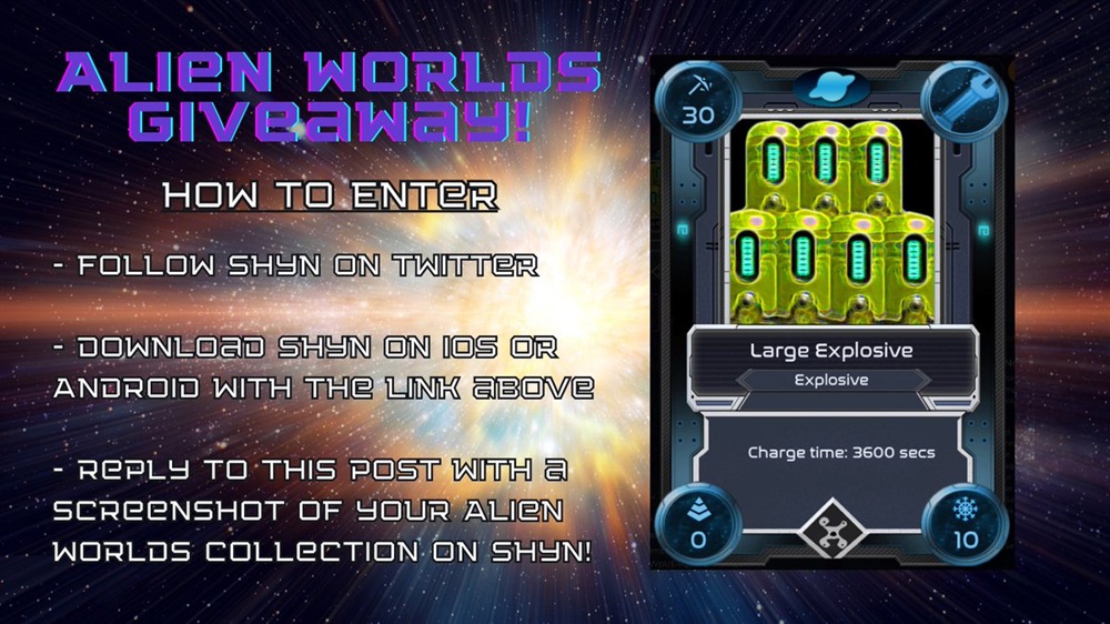 BOOM! #alienworlds Large Explosive GIVEAWAY starts NOW! Follow the instructions below to enter. Giveaway will end tomorrow (3/23/22) at midnight, & we’ll be back Thursday to announce a winner! iOS: apple.co Android: bit.ly