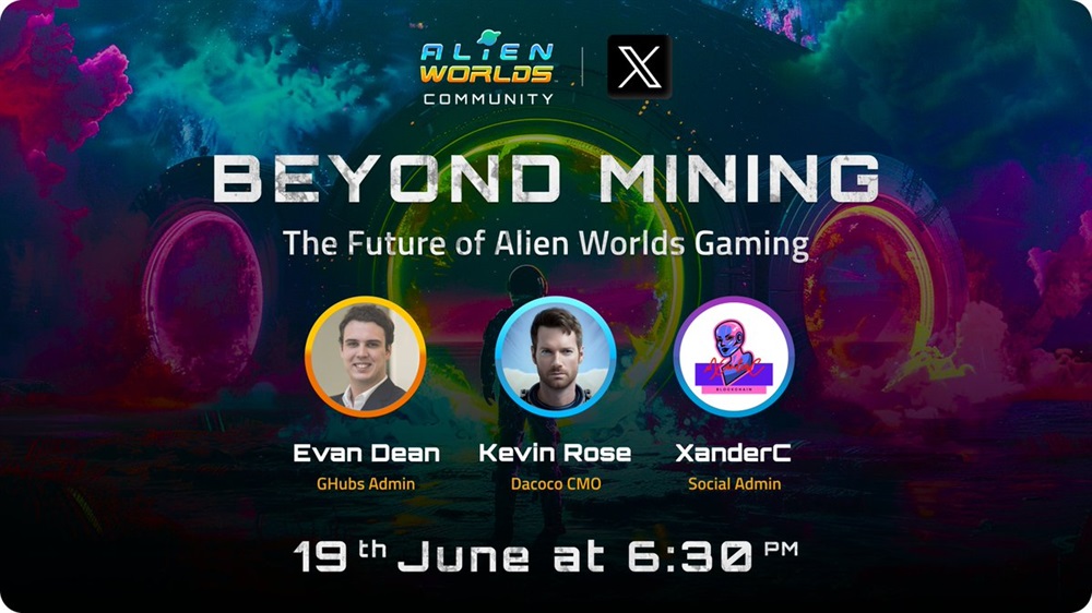Alien Worlds will host a community call on X on June 19th at 6:30 pm UTC. The discussion will feature Evan Dean, the Galactic Hubs administrator and Kevin Rose, the CMO of dacoco.io.