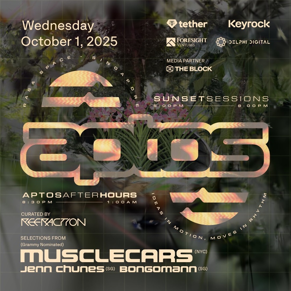 Aptos will hold its Sunset Sessions and After Hours events on October 1 in Singapore as part of TOKEN2049. The gatherings will feature networking opportunities with industry leaders, co-hosted by Tether, Keyrock, Foresight Ventures, and Delphi Digital, and curated by RefractionDAO.