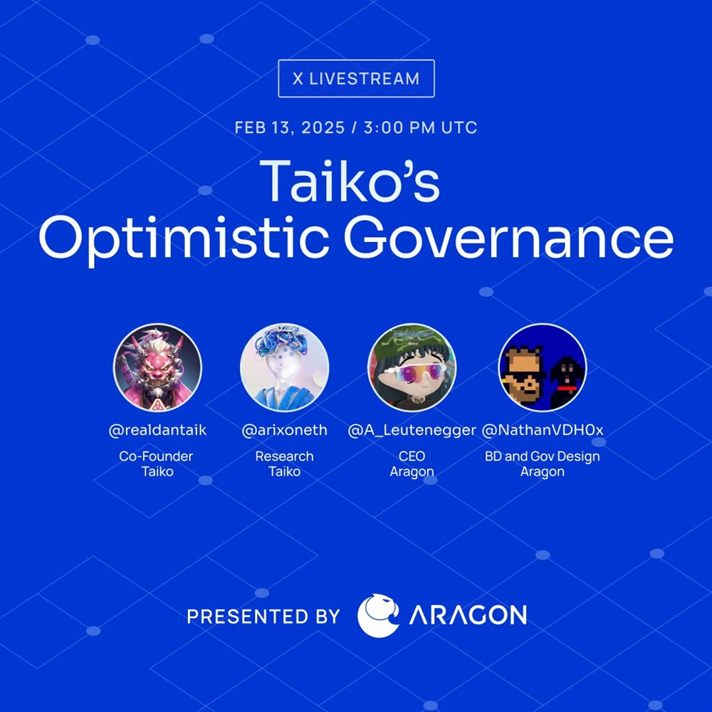 The livestream will focus on Aragon’s custom governance build for Taiko.eth, their decentralization plans, and the roadmap to mainnet.