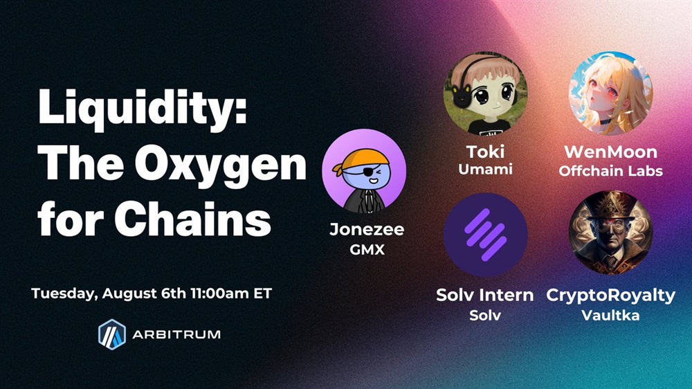Arbitrum will host an AMA on X on August 6th at 11:00 am UTC. The conversation will feature GMX, Umami Vaultka, Solv Protocol, and Off-chain Labs. The main topics of discussion will be liquidity and capital efficiency in the DeFi sector.