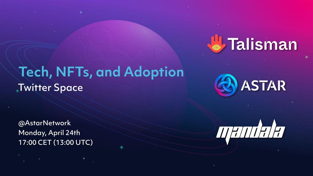 📢 Exciting news! Join us next week for a Twitter space with @wearetalisman x @enterthemandala x @AstarNetwork on Tech, NFTs, and Adoption! Set your reminders for April 24th, Mon @ 3 PM UTC and don't miss out on this epic trifecta of magnitude. 🔥