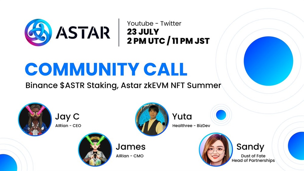 Astar is set to host a community call on July 23rd at 2 pm UTC. The discussion will revolve around integrating Binance ASTR staking and launching NFT collections on Astar’s zkEVM.