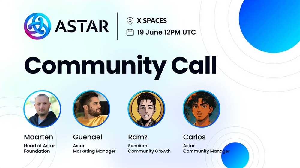 Astar will host a community call on June 19th at 12:00 UTC. The agenda includes network updates from the head of Astar, Maarten Henskens and a segment led by the community manager, Carlos Rodríguez.