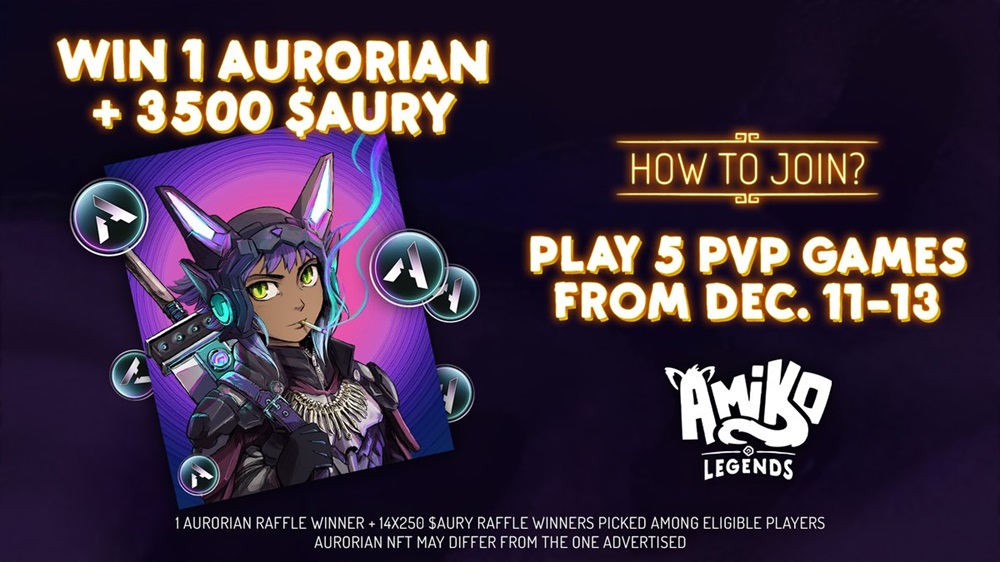 Win at least 5 PvP games on Amiko Legends between dec 11 and dec 13 to enter a raffle for one Aurorian and a $3,500 AURY prize pool.