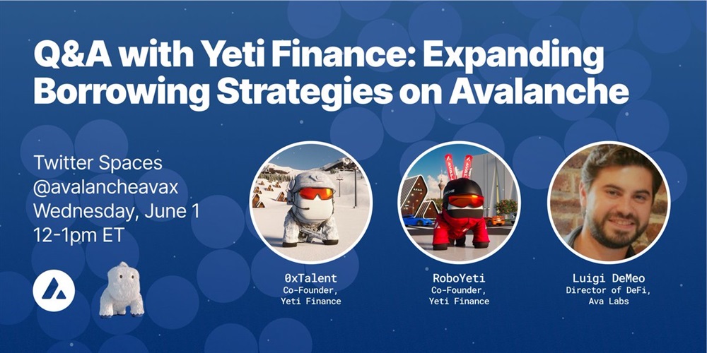 .@YetiFinance's co-founders @0xRoboYeti and @0xTalent will be joining #Avalanche Spaces tomorrow for a Q&A on the expansion of lending protocols in the ecosystem. Set a reminder via link below!