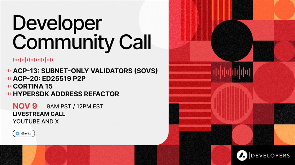 Avalanche will hold a community call on November 9th at 5 pm UTC. The call will cover topics such as ACP-13 (subnet only validators), the latest updates on Cortina 15, and further developments with the HyperSDK.