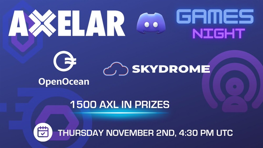 Axelar is hosting a Discord games night in collaboration with OpenOcean and Skydrome. The event is set to take place on November 2nd at 4:30 pm UTC. The games night will feature a trivia contest where participants will be tested on their knowledge of all three projects. A total of 1500 AXL will be awarded as prizes during the event.