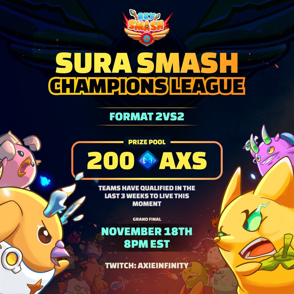 Axie Infinity is set to host the Grand Finals of the SURA Smash Champions League on Twitch on November 19th at 1:00 AM UTC.