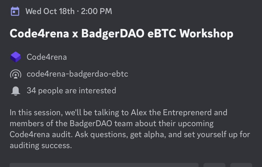 Come join our event wednesday 2pm in the Code4rena discord as we walk eager Badgers through the eBTC codebase & have an AMA in preparation for the upcoming contest.