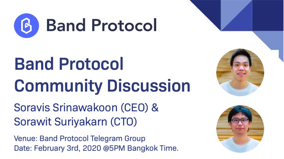 📣Have questions about $BAND 2.0 and its development? Band Protocol's CEO @SSrinawakoon and CTO @nomorebear will be hosting a community discussion and AMA session on our Telegram group (t.me) on Feb 3rd, 2020 @5PM Bangkok time (GMT+7). See you there soon!