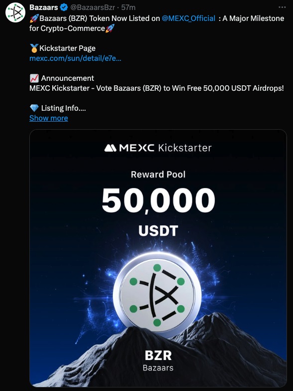 MEXC will list Bazaars (BZR) on February 27th at 9:00 UTC.