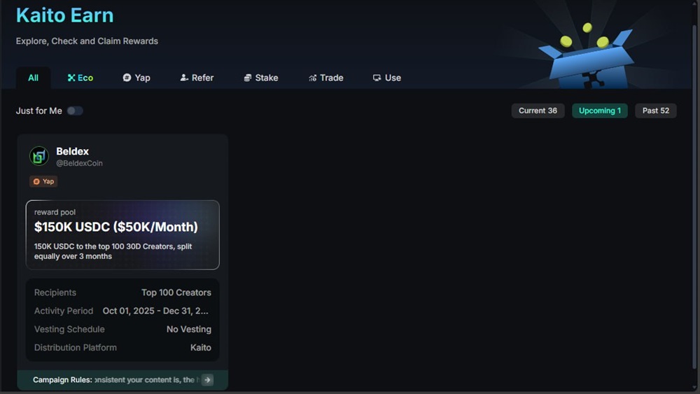 Beldex introduces a three-month rewards campaign on Kaito Earn, running from October 1 to December 31. The program offers a total prize pool of $150,000 USDC, distributed at $50,000 per month among the top 100 participants, referred to as “Yappers”. The campaign aims to stimulate engagement and content activity within the ecosystem.