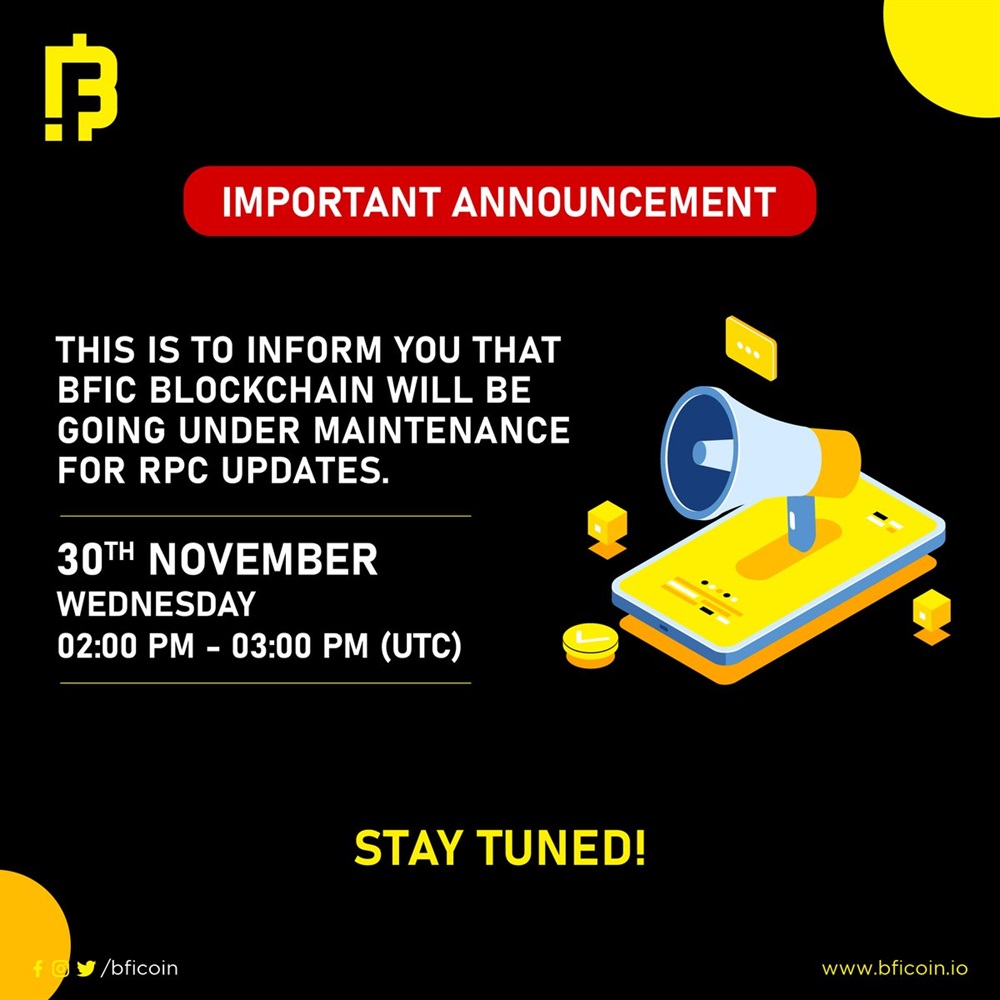 This is to inform you that the #BFIC Blockchain will be going under maintenance for RPC Updates on 30th November, Wednesday