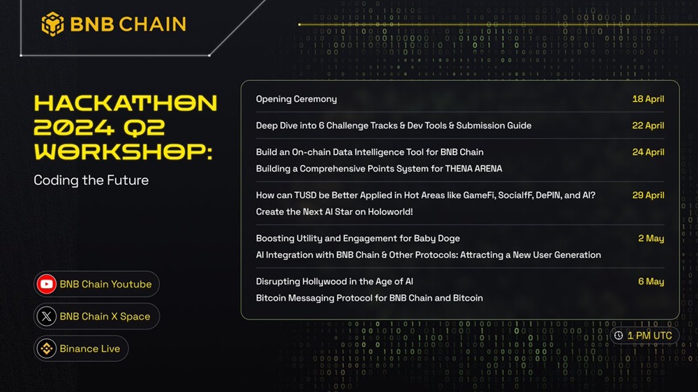 Binance Coin is set to host a workshop titled “OneBNB — Coding the Future” as part of the BNBChainHackathon2024, taking place from April 18th-May 6th. The workshop will focus on the future of decentralized applications and the exploration of their potential.