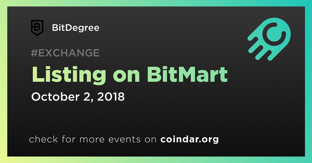 More exchanges! The BitDegree Token is now available on BitMart with the BDG/BTC and BDG/ETH trading pairs. Read the full story on our blog blog.bitdegree.org or jump right in and start trading on bitmart.com