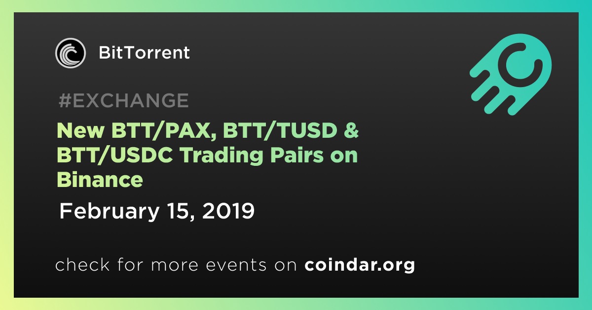 Binance will open trading for BTT/PAX, BTT/TUSD and BTT/USDC trading pairs at 2019/02/15 10:00 AM (UTC).
