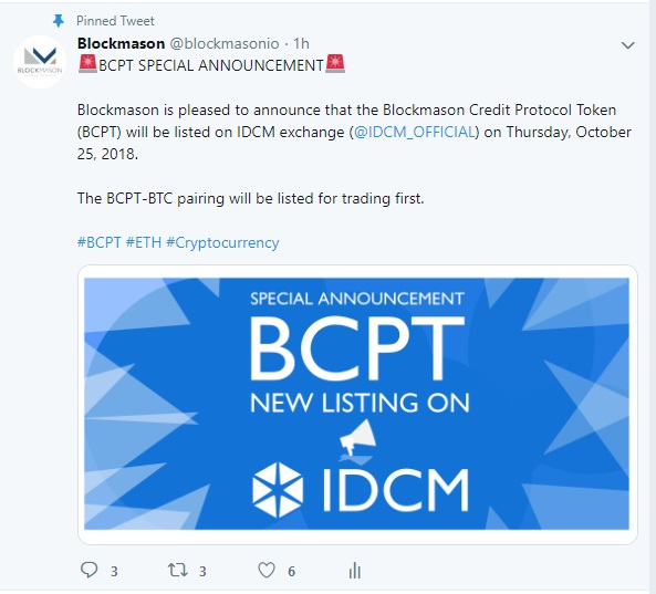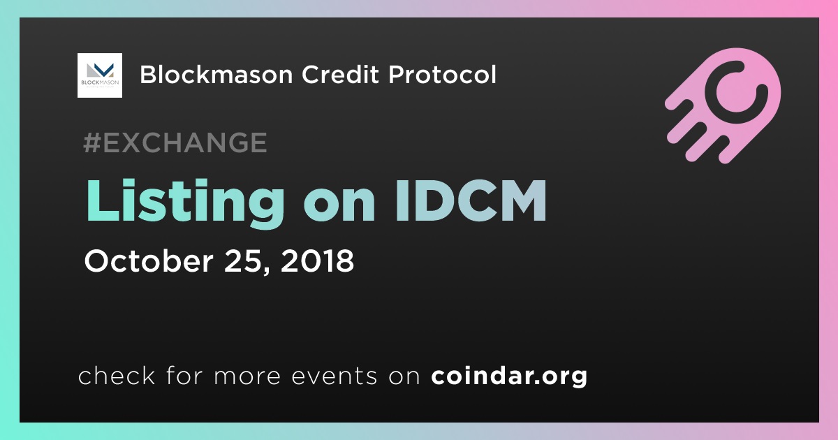 Blockmason is pleased to announce that the Blockmason Credit Protocol Token (BCPT) will be listed on IDCM exchange (@IDCM_OFFICIAL) on Thursday, October 25, 2018.