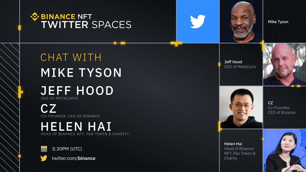 @Miketyson, @jeffrhood, @cz_binance, and @HelenHaiyu will be joining us on a Twitter space today to discuss the upcoming Mike Tyson NFT drop on @TheBinanceNFT marketplace on April 5th 2022.