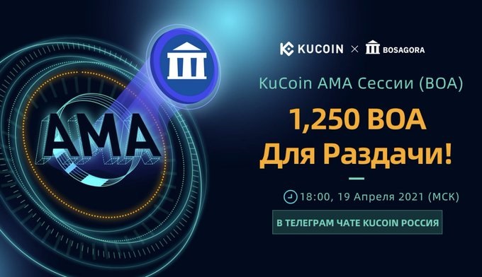 BOSAGORA is having its very first Russian AMA! Join us 😍👉 Присоединяйтесь к @kucoincom #AMA c BOSAGORA (t.me)(BOA), Розыгрыш 1 250 BOA!