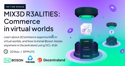 Boson Protocol will host an AMA on X on the topic of “MIX3D R3ALITIES: commerce in virtual worlds” on the 20th of November at 5 pm UTC. The event will feature speakers from THE HUB, Decentraland and Boson Protocol, including the co-founder of Boson Protocol, Justin Banon.