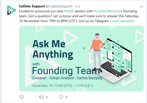 Excited to announce our next #AMA session with #CallistoNetwork's founding team. Got a question? Let us know and we'll make sure to answer this Saturday, 10 November from 7PM to 8PM (UTC). Join us on Telegram t.me