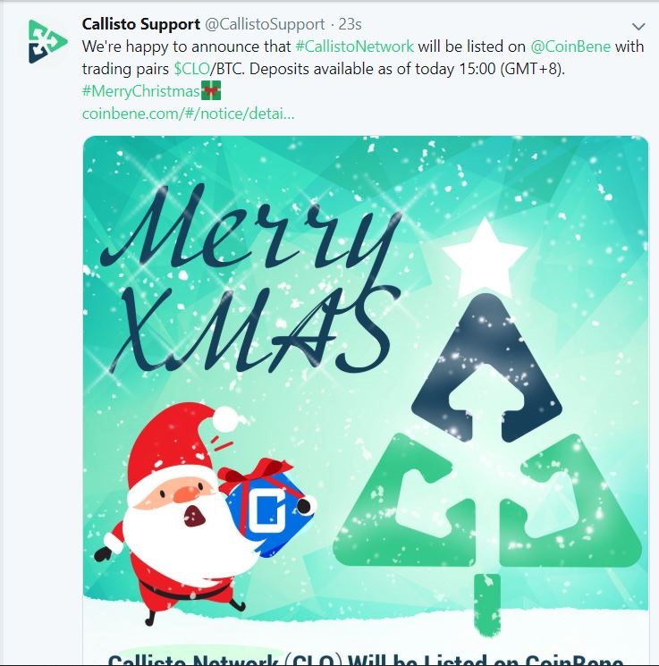 We're happy to announce that #CallistoNetwork will be listed on @CoinBene with trading pairs $CLO/BTC. Deposits available as of today 15:00 (GMT+8). #MerryChristmas