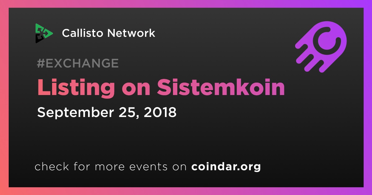 Callisto Network will be listed on SistemKoin. Trading will start 25/09/2018 around 08:00