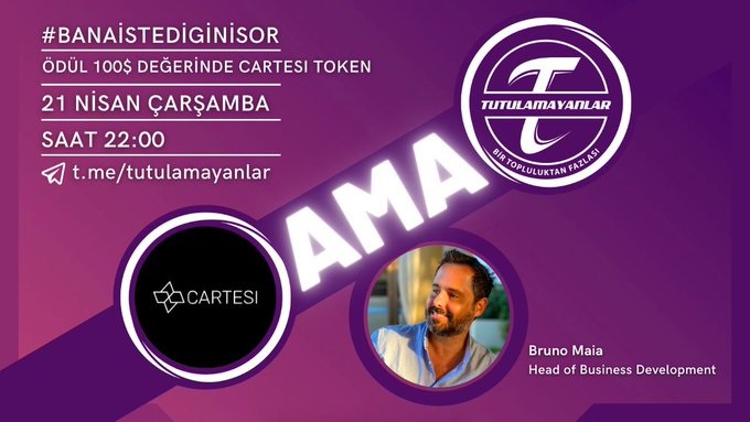Join us on April 21st at 7:00 PM UTC for an #AMA in the Turkish @_tutulamayanlar Telegram Community with @bmaia_expat, Head of BD at #Cartesi! $CTSI