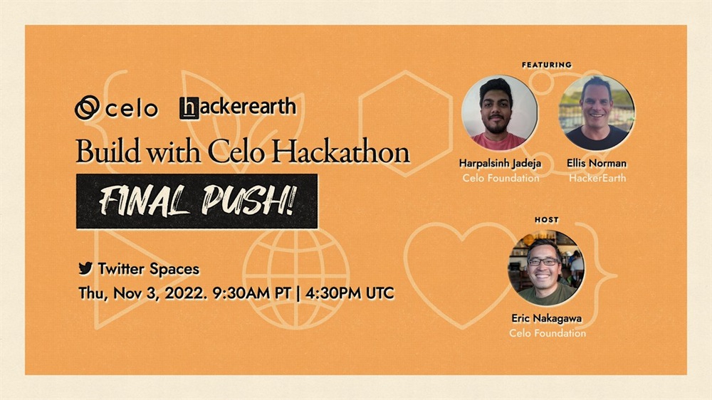 Tomorrow! Join @ericnakagawa, @harpaljadeja11, and @EllisJNorman1 as Phase 2 of the #BuildWithCelo Hackathon comes to an end. ⚒️