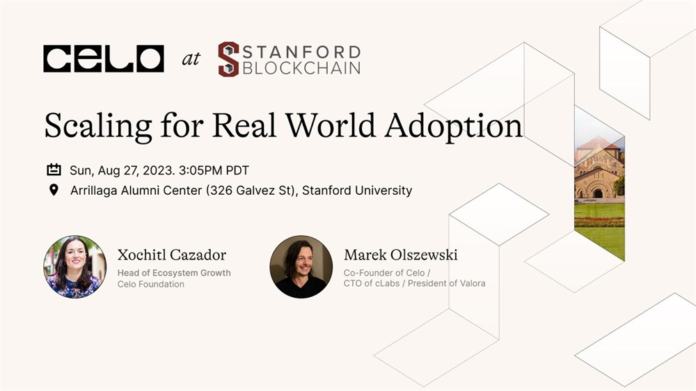 Celo’s co-founder, Marek Olszewski, and the head of ecosystem growth, Xochitl Cazador, are set to participate in the Blockchain Application Stanford Summit on August 27th. The focus of their participation will be on discussing the scaling for real world adoption and the proposal to migrate Celo from L1 to L2.