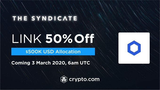 Are you ready for the next event on The Syndicate? 50% off on #Chainlink $LINK (US$500K allocation) on 3 March 6am UTC. Stake $CRO to participate! Details here - blog.crypto.com #LINK