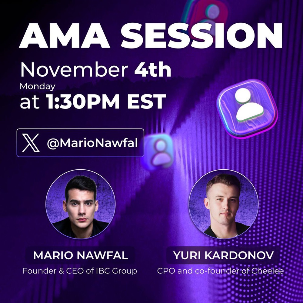 Cheelee will host an AMA on X on November 4th at 18:30 UTC. The session will feature Yuri Kardonov, CPO and co-founder of Cheelee, alongside Mario Nawfal, founder and CEO of IBC Group. The discussion aims to explore the concept of SocialFi and the potential synthesis of Web2 and Web3 technologies.
