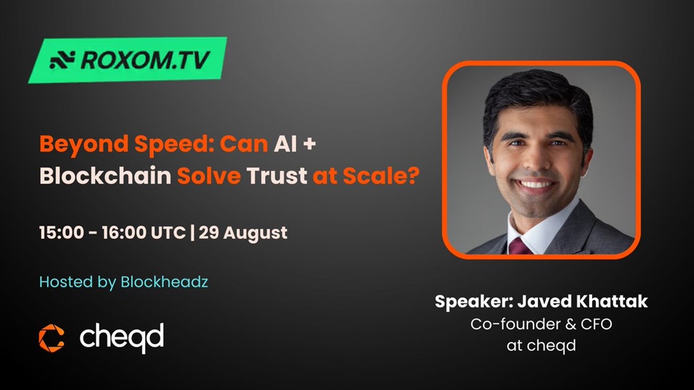 CHEQD Network has announced its participation in the upcoming RoxomTV panel discussion titled “Beyond Speed: Can AI + Blockchain Solve Trust at Scale?”, scheduled for August 29, 15:00–16:00 UTC. Javed Khattak, Co-founder and CFO of cheqd, will represent the project.