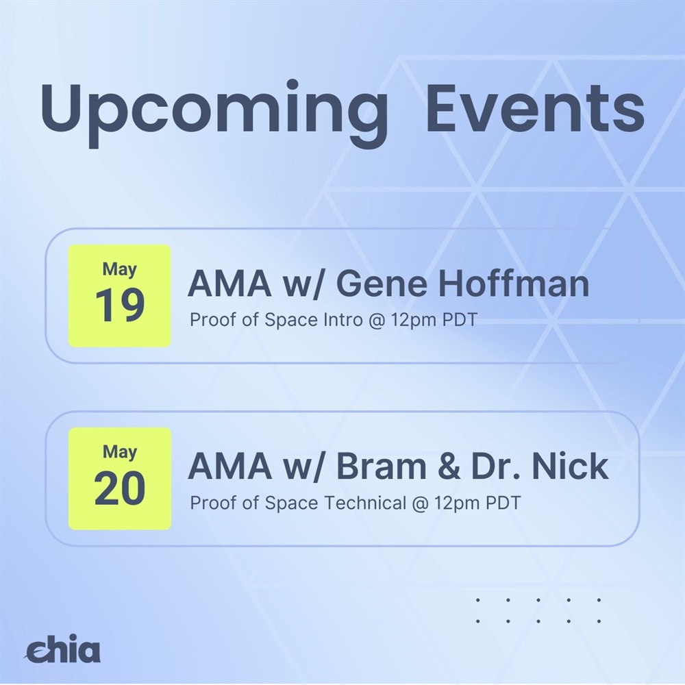 Chia will hold an AMA on Zoom on May 20th to present forthcoming changes to the plot format. The introductory discussion on May 19th will feature the CEO, Gene Hoffman, while the technical review on May 20 May will include the CTO, Bram Cohen.