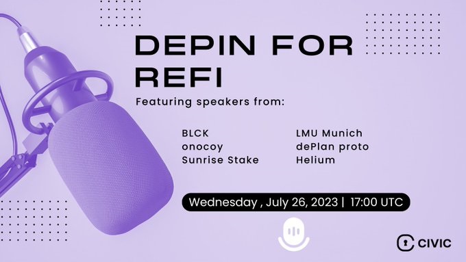 Civic will host an AMA on Twitter on the topic of dePIN for ReFi. The event will feature experts from various organizations including the Helium Foundation, Onocoy Association, Blck Iot, and De Plan Proto. The purpose of the event is to provide insights and understanding about dePIN for ReFi. The event will take place on July 26th at 17:00 UTC.