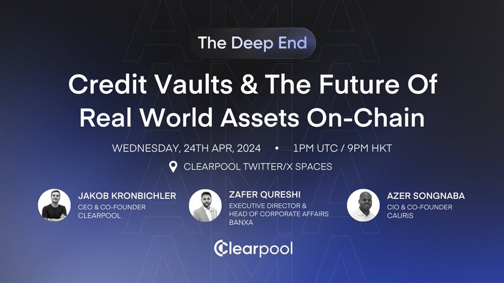 Clearpool will host an AMA on X on April 24th at 1 pm UTC. The speakers for the event include Jakob K, the CEO and co-founder of Clearpool, and Zafer Qureshi, an executive. They will be discussing the implications and potential future developments of RWAs on-chain.