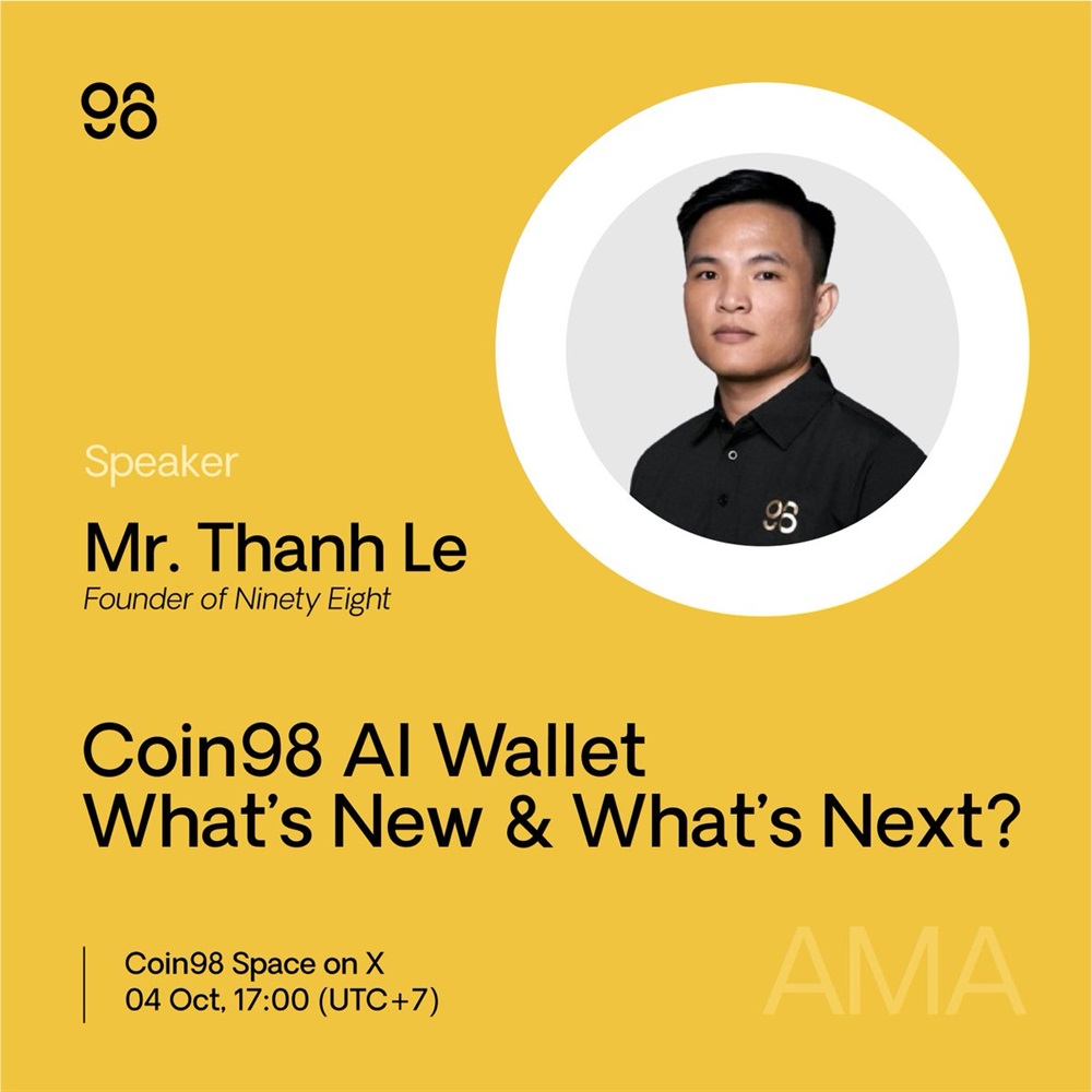 Coin98 will host an AMA on X on the Coin98 AI wallet, focusing on the latest updates and plans. The event is scheduled to take place on October 4th at 10:00 am UTC.