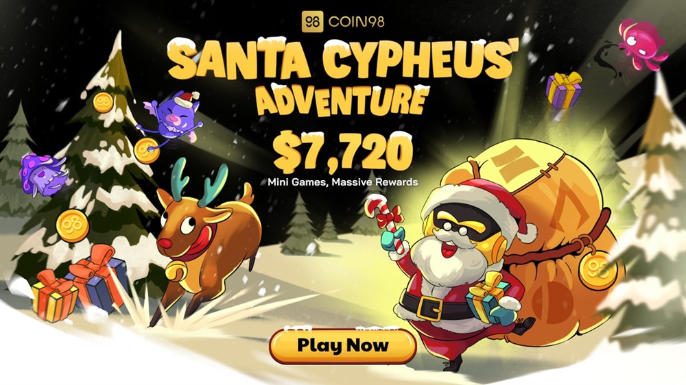 Coin98 is hosting an event titled “Santa Cypheus' Adventure” with a total prize pool of $7,720. The event is divided into two parts: the Random Reward with a total prize of $6,720 and the Lucky Mint Reward with a total prize of $1,000. The main event will start on December 20th and will conclude on January 16th.