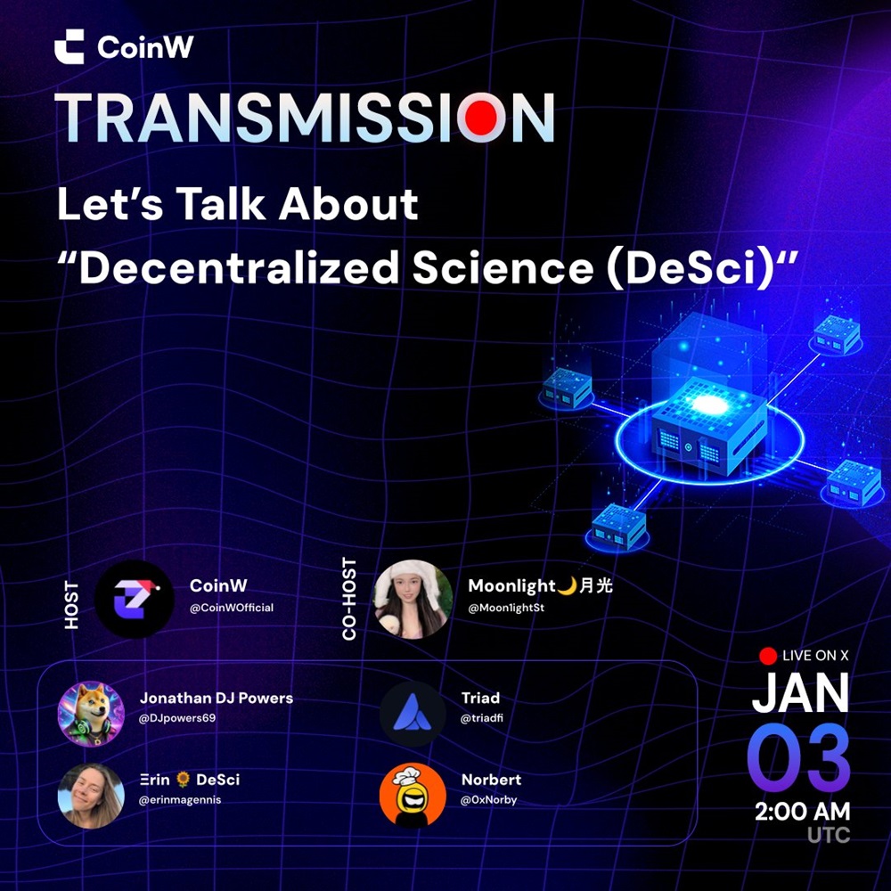 CoinW will host an AMA on X focusing on the topic of DeSci on January 3rd at 2 AM UTC.