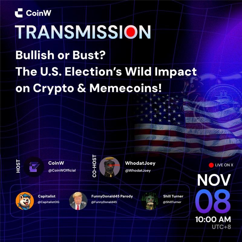 CoinW will host an AMA on X on November 8th. The conversation will mainly focus on the potential impact of the U.S. election on the cryptocurrency and memecoin markets.