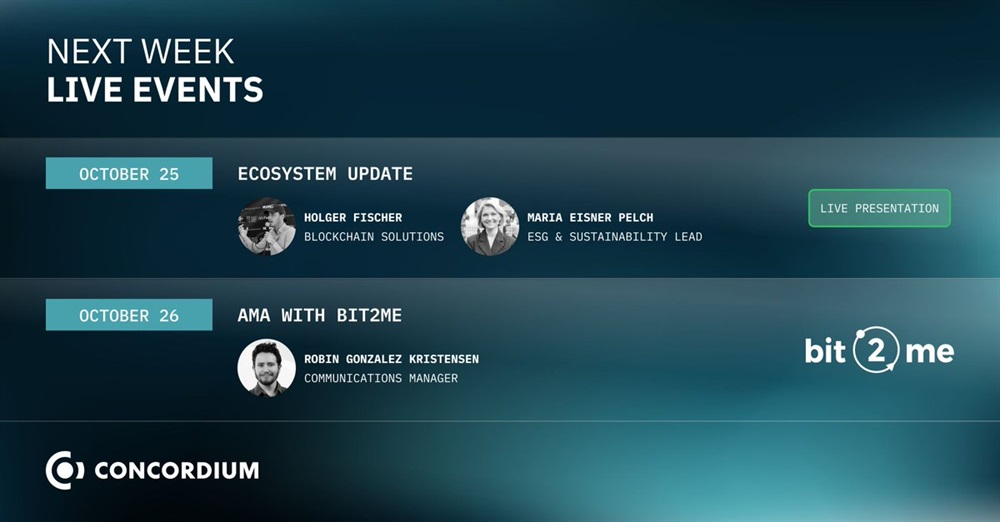 Concordium will host an AMA on X on October 25th at 12:00 UTC. The session will be on an ecosystem update and will be presented by the commercial team members Maria Eisner Pelch and Holger Fischer.