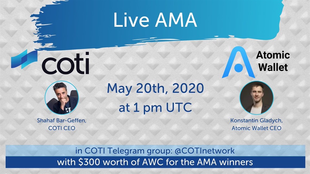 COTI will host @AtomicWallet for a live AMA. Prepare your questions for the AMA in response to this twitter post for a chance to win $AWC.